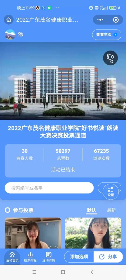 2022年5月15日👩🏼🦰,彩神“青春校园,翰墨书香”之“好书悦读”朗读大赛30个入围决赛的作品正式结束投票环节,经过7天的投票,最后总投票数为50297票,票数第一为20高职护理10班谭译云的《风》,该作品累计得票数为6332票,本次活动的总浏览次数为67952次。以下为本次大赛的获奖情况♿️🧑🏻🦼:
