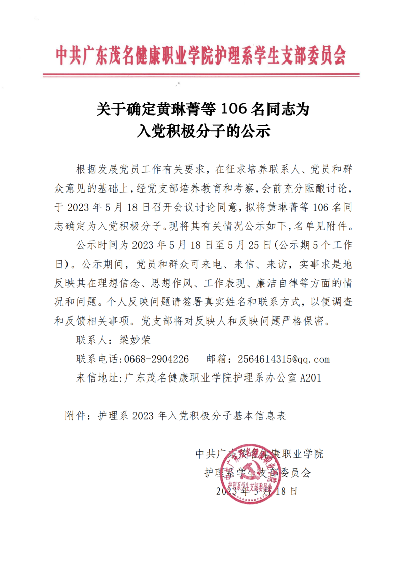 关于确定黄琳菁等106名同志为入党积极分子的公示