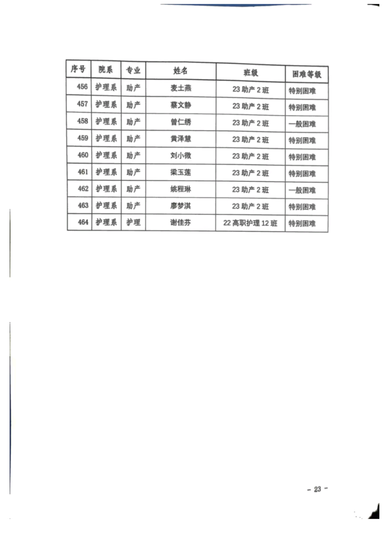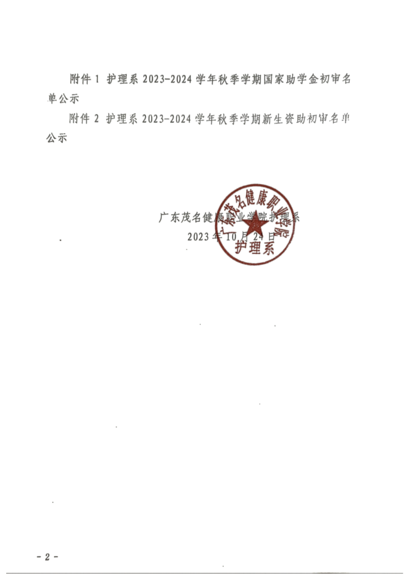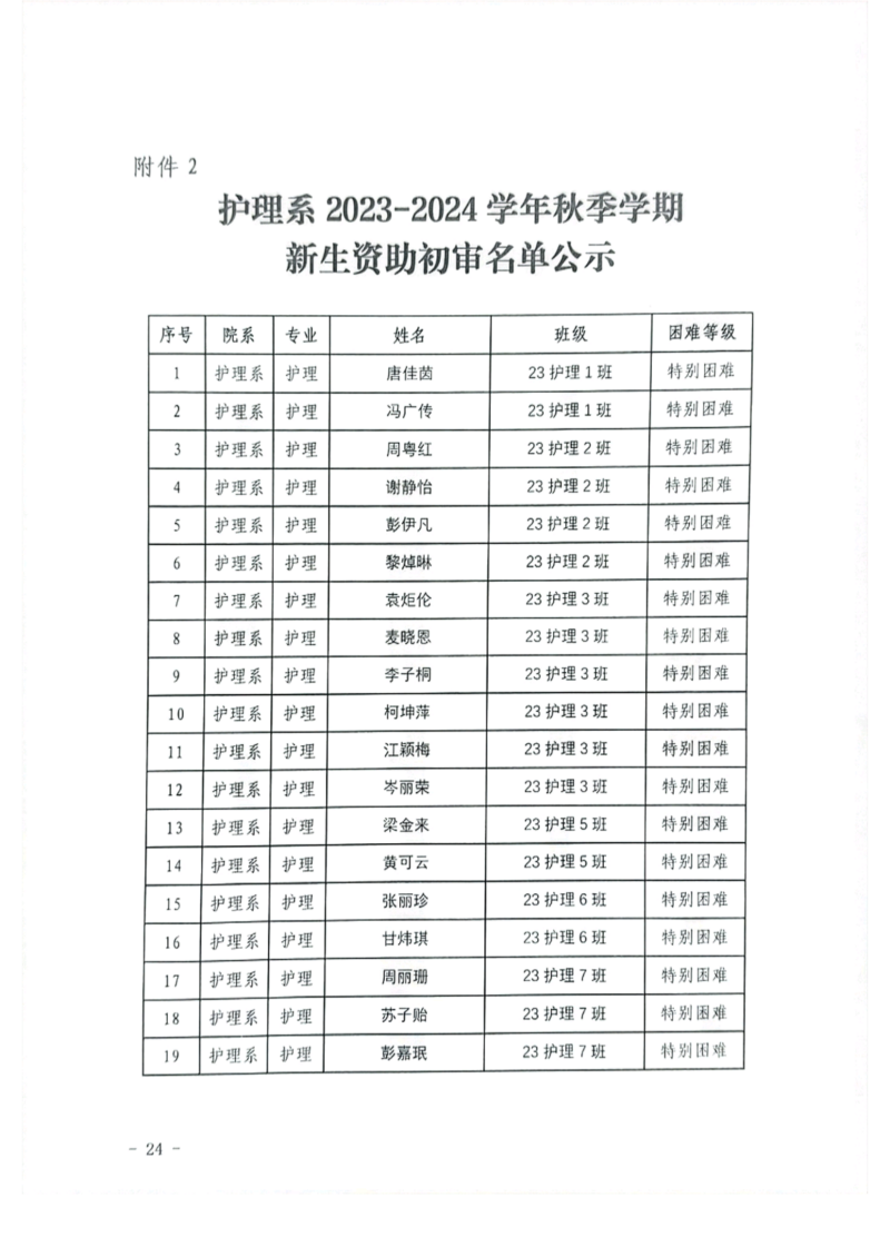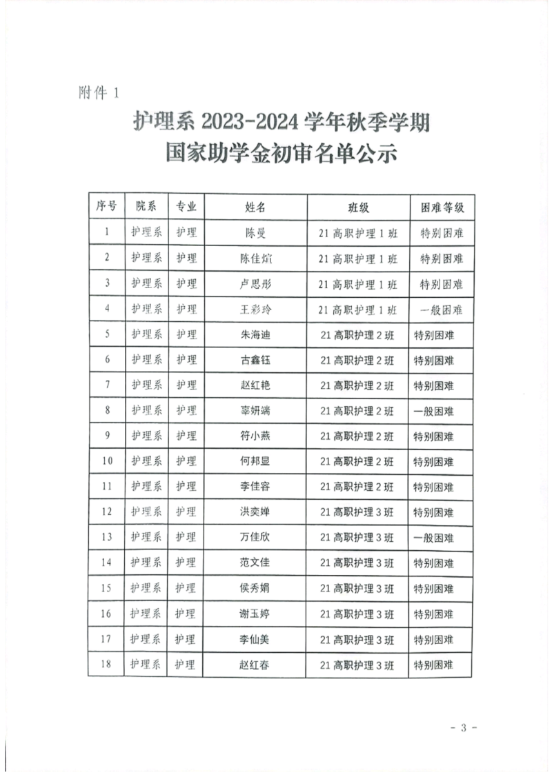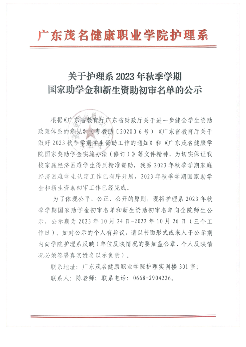 关于护理系2023年秋季学期国家助学金和新生资助初审名单的公示