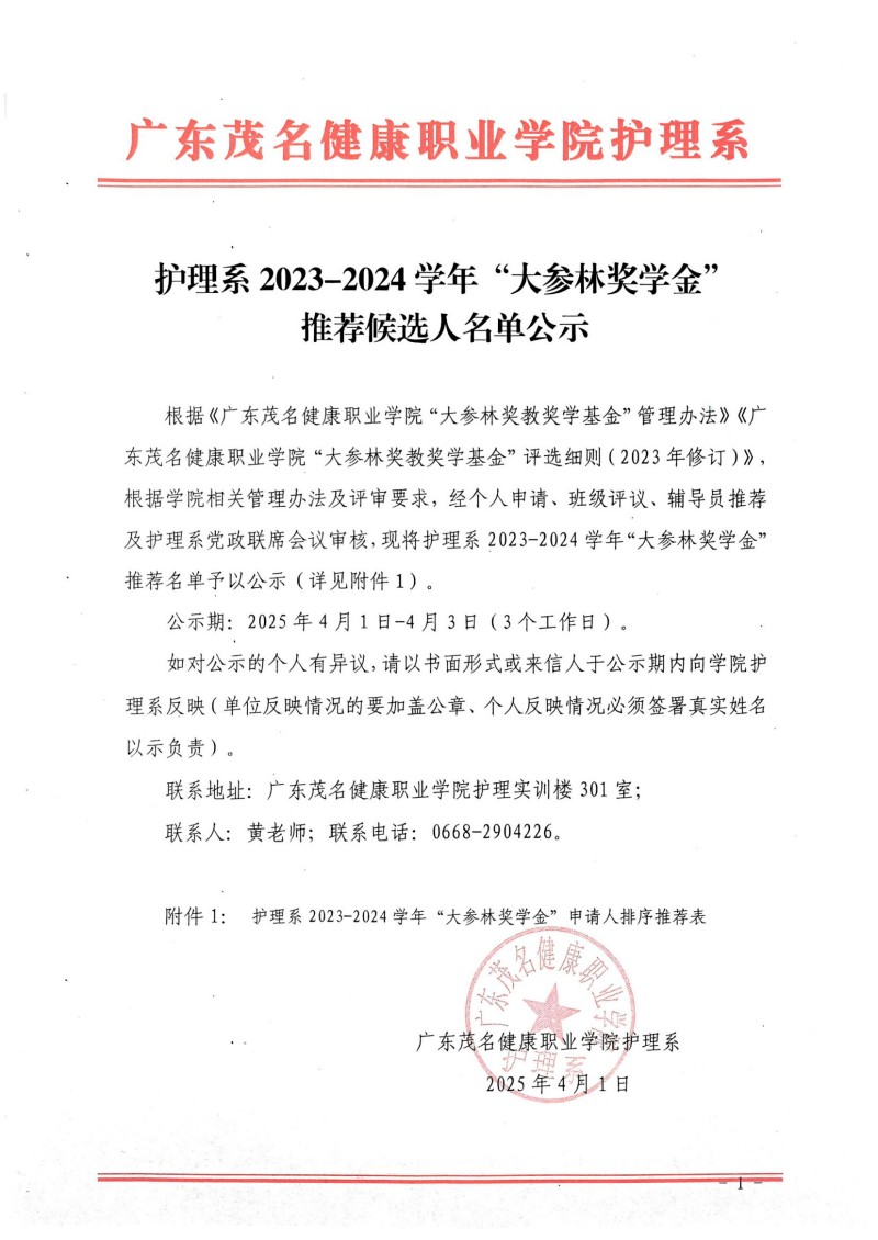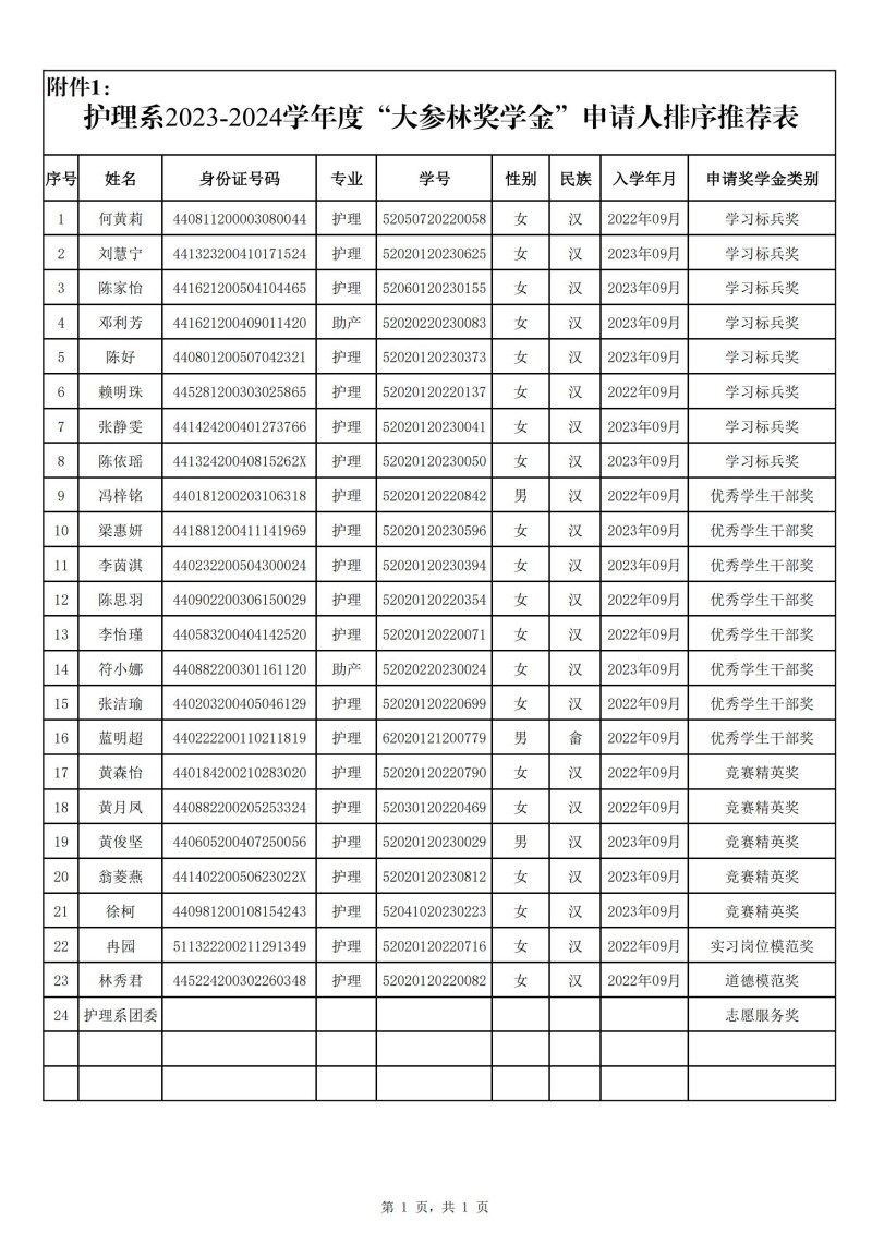 护理系 2023-2024学年“大参林奖学金"推荐候选人名单公示